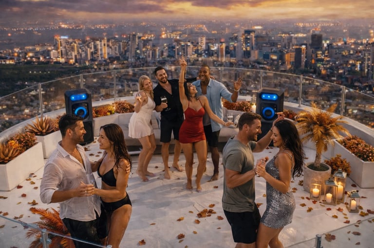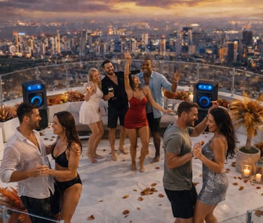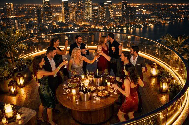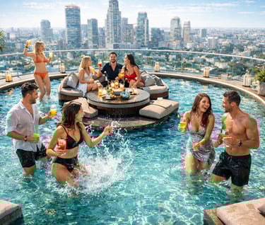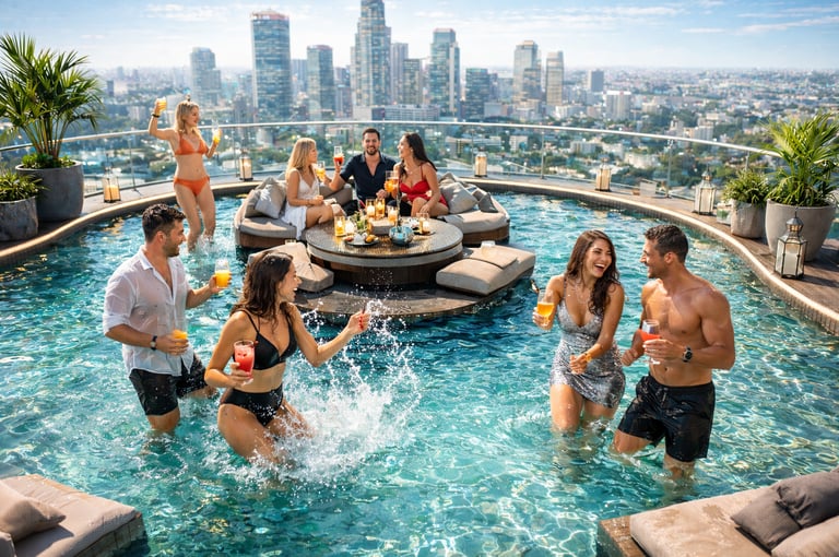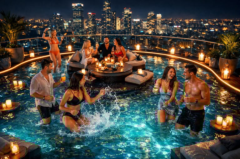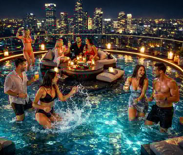 Private rooftop pool cabin, candlelit skyline views, luxury vibes, ultimate party destination, unforgettable nights with friends, music, drinks, celebrations.