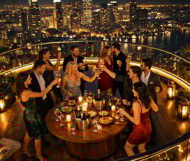 Luxury rooftop private cabin, sparkling skyline views, candlelit elegance, champagne celebrations—book now for unforgettable nights above the city lights.